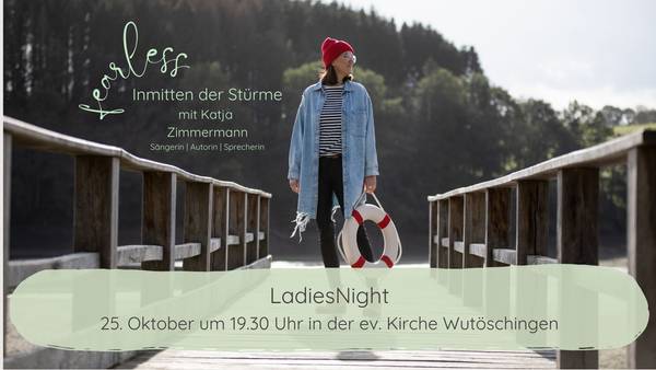 Die LadiesNight mit Katja Zimmermann findet am Freitag, den 25.10. um 19.30 Uhr in der ev. Kirche in Wutöschingen statt. Neben Getränken und Snacks erwartet euch an dem Abend tolle Gemeinschaft mit anderen Frauen, Tiefgang, wunderschöne Lieder von Katja Zimmermann und ganz viel Ermutigung für die Stürme in eurem Leben. Wir freuen uns auf euch!